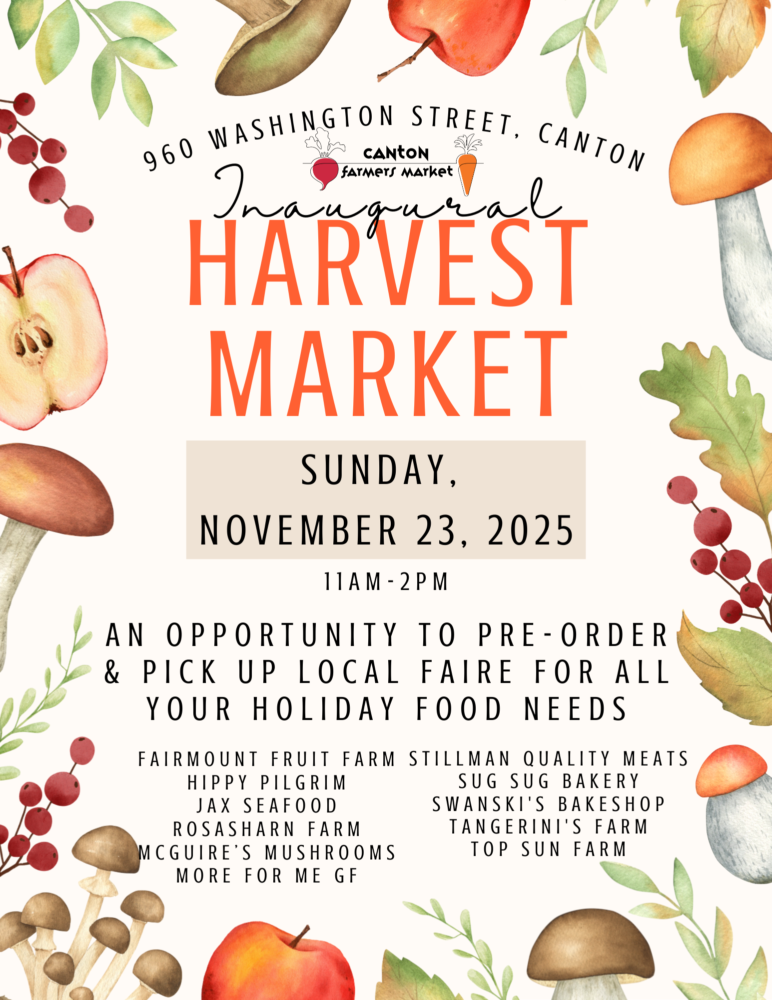 November 23 @ 11am - 2pm X Google Outlook iCal Add to calendar Image Visit Canton Farmers Market's special Harvest Market for all your holiday needs! Pre-orders for turkeys, pies and more available on website. Details Category Family Fun Website https://www.cantonfarmersmarket.org/our-vendors/harvest-market Organizer Canton Farmers Market https://www.cantonfarmersmarket.org/home Venue Canton Farmers Market 960 Washington Street Canton, MA 02021 United StatesMap/Directions